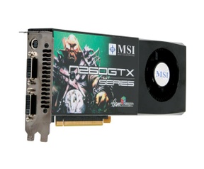 MSI N260GTX-T2D896-OC, dus de nieuwere versie met 896 MB of GDDR3 memory (on a 448-bit bus), 620 MHz GPU speed, 1,296 MHz Shader Speed en 2,160 MHz Memory.