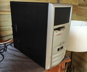 - Behuizing: Een compaq behuizing van begin jaren 2000, nieuw verfwerk voorzien aan de buitenkant, nieuwe aan/uit knop met diepe klik en blauwe led. Ik kon niet blijven toekijken op het verstoffen van deze kast, die lang genoeg in de hobbyruimte stond. Hij stond vol met krassen en was nooit echt schoon te noemen.