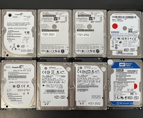 De foto is enigszins verouderd, voor een volledig overzicht zie hieronder. Voor alle schijven zijn SMART-rapportages beschikbaar. Alle schijven zijn getest op data-integriteit met h2testw. Vraag gerust om board IDs, firmware, etc. mocht je een schijf zoeken voor donor-onderdelen.