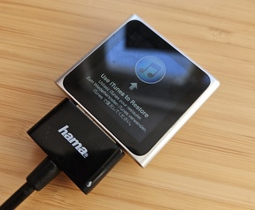 In de oplader gaat de iPod aan maar komt deze met het "Connect to iTunes to restore" scherm. Ik heb helaas geen 30 pins kabel meer om dit te doen.