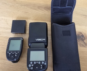 Bijna niet gebruikt, flitser, trigger, softbox en een reflectiescherm
