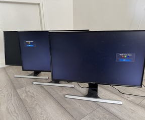 Originele voedingskabels aanwezig. HDMI-kabels niet aanwezig. Monitoren hebben geen VESA-aansluiting.