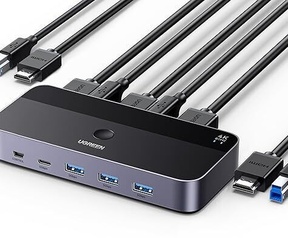 Titel artikel op amazon: UGREEN HDMI 2.0 KVM Switch 4K@60Hz USB 3.0 Switch 4 USB poorten (3*USB 3.0+ USB C) Delen van 1 Monitor en Toetsenbord, Muis, Printer, U-Schijf voor 2PC met 2 USB Kabels en 2 HDMI Kabels.