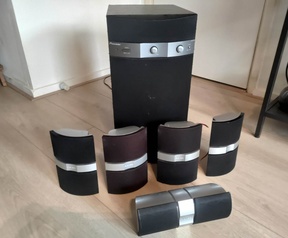 Deze zet heeft slijtage sporen (kleine gaatje aan het doek en krassen bovenzijde subwoofer) maar werkt verder gewoon goed.