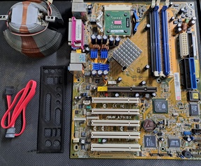 -Asus A7N8X Deluxe 2.0 met nieuwste bios, geen origineel I/O shield; wél eentje geprint van PLA. Ik heb ook Zalman heatsinkjes op de VRM's geplaatst. Northbridge heatsink heb ik er niet afgehaald, wordt wel warm dus wellicht iets om zelf aan te pakken? Nieuwe CMOS batterij. In keurige staat met volgens mij nog de originele elco's.