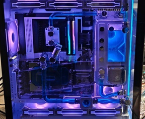 Waterkoeling: TG Direct Die CPU blok (wit gespoten), Byski 7900 XTX GPU blok, 3x 360mm Corsair XR5 rads, Barrow pump/res combo, Barrow fittings zilver, Barrow hardtubes, Aqua Computer DP Ultra vloeistof blauw)