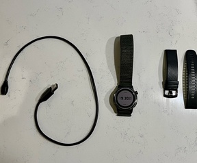 Met oplader, nylon (donkergroen) en originele siliconen bandje (zwart).