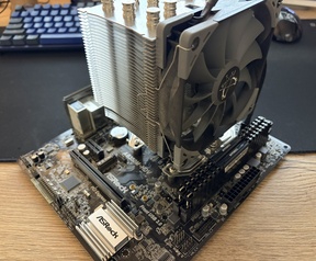 ASROCK AB350M-HDV met een 2x8GB Corsair CMK16GX4M2B3000C15 en een Ryzen 1700X en Scythe tower cooler gemonteerd.