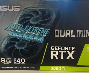 Een Asus GeForce RTX 3060 Ti Mini grafische kaart. Deze kaart is perfect voor compacte systemen en biedt uitstekende prestaties voor gaming en andere grafische toepassingen.