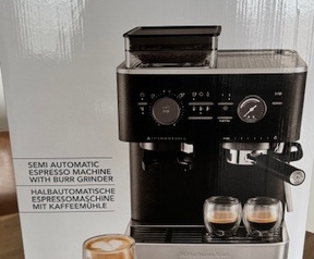 KitchenAid luxe halfautomatische espressomachine met ingebouwde koffiemolen in de stijlvolle kleur Vulkaanzwart.