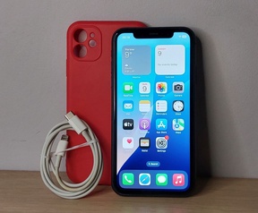 De telefoon wordt geleverd zonder de originele doos, maar met een oplader, kabel en rood hoesje.