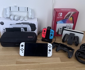 - Originele doos met kabels en accessoires (adapater, dock, HDMI kabel, joy con grip, boekjes)