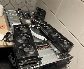 3x RTX 4090 hangen buiten de behuizing via PCIe Gen4-risers van ca. €30–60 per stuk (goede kwaliteit, inbegrepen bij de verkoop.)