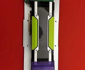 Nvidia Tesla P100 16GB gebruikt voor compute-taken (geen video-uitgangen). De kaart wordt geleverd met een adapter voor 2x40mm ventilatoren, zodat je hem in een standaard pc-kast kunt gebruiken.
