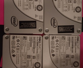 Titel spreekt voor zich. 4 mooie S4610 1,92TB drives, gaan nog heel lang mee met ca. 10 petabytes endurance over (een factor 20 meer dan zelfs goede consumenten drives!) en slechts iets meer dan 10k uur uptime per drive, geen rare SMART errors, de laatste firmware van Dell erop gezet dus dat risico hoef jij niet te nemen, kerngezond!