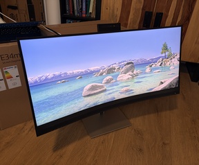 Heel mooi scherm voor thuiswerken, met ingebouwde speaker, camera en microfoon en veel aansluitmogelijkheden (bijv. USB-C voor laptop)