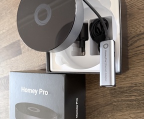 Komt zoals op de foto's met adapter, usb-c kabel, ethernet dongle en de Homey zelf
