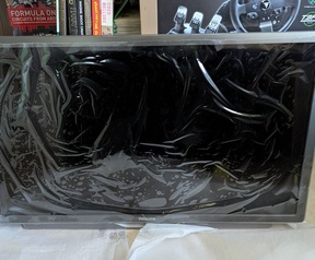 In goede staat. Staat in werkkamer beschermt met plastic folie (overgenomen van de nieuwe tv vandaar zo golvend) en dun stoot folie.