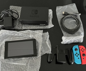 Inclusief kabels, dock, joycons, cradle, joycon, straps,