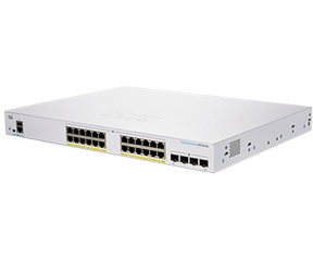 De Cisco CBS350-24P-4G is een geavanceerde managed switch met 24 Gigabit PoE+ LAN-poorten (195W) en 4 Gigabit SFP-poorten. De CBS350-24P-4G is voorzien van layer 3 beheeropties, VLAN en QoS en beschermt uw bedrijfsnetwerk met talloze securityfuncties.
