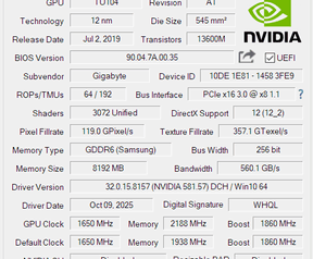 De kaart kan behoorlijk worden gepushed met (bv. MSI Afterburned), power target naar 122% wat de kaart naar ca. 300W totaal vermogen brengt. Ook kan het geheugen stabiel naar +1000Mhz extra worden gepushed, wat de totale bandbreedte naar 560.1GB/s brengt. (Zie GPU-Z)