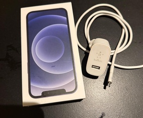 De originele doos is aanwezig, en er wordt een Belkin oplader met Lightning kabel meegeleverd.