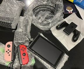 Inclusief kabels, dock, joycons, joycons, straps en cradle.