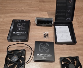 De fans zijn schoongemaakt en komen met alle originele accessoires (zie foto's) en een 1-naar-2 4 pins PWM kabel voor wie dat wilt. De stickers heb ik van de voorkant afgehaald voor een minder opvallende look.