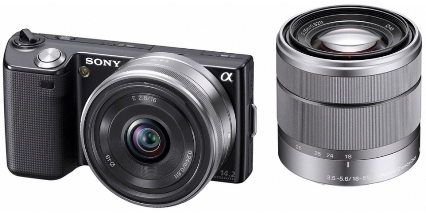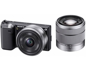 Exmor APS HD CMOS-sensor van 14,2 MP, HD 1080i-film, LCD 7,5 cm, Draaipanorama. Set met twee lenzen.