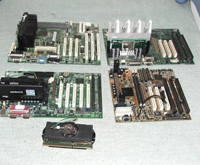 In totaal zijn het oa. 5 slot1 moederboarden, 5 pentium2/celeron processors en 7 sdram repen: