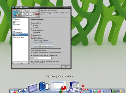 ObjectDock 1.5 has a ton..TON of new features in it. These features include Windows Vista compatibility, a new image searching feature, .DockZip support, a new algorithm for zoom docks, drag and drop support for items on docks, tabbed docks rotate automatically when docking them with a screen edge if necessary, a host of mouse-over activation features, and more.[break]