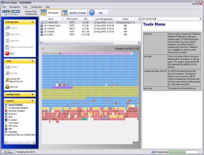 Raxco Software heeft een update uitgebracht van van zijn defragmenteersoftware PerfectDisk. Dit programma reorganiseert de locatie en volgorde van de bestanden op de harde schijf, zodat deze sneller te benaderen zijn. Dit resulteert in het sneller starten van programma's en het sneller booten van de pc. PerfectDisk is geschikt voor Windows 2000 en hoger, voor zowel de 32- en 64-bits, als Itanium varianten. Een evaluatieversie kan vanaf deze pagina worden gedownload, upgraden kan vanaf hier. Prijzen beginnen bij veertig dollar. Het changelog van versie 8.0 build 66 laat de volgende bugfixes zien: