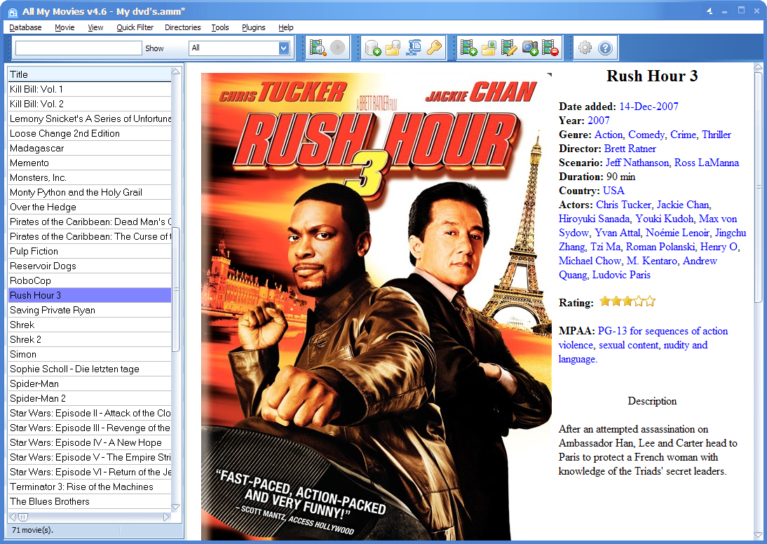 Bolidesoft heeft vrijdag versie 4.6 build 1250 van All My Movies uitgebracht. Dit programma is bedoeld als hulpmiddel om je filmcollectie te catalogiseren. Dit geldt niet alleen voor de bestanden op de computer, maar ook voor videocassettes, video-cd's en uiteraard dvd's. All My Movies kan de inhoud van de cd- of dvd-drive lezen en zoekt desgewenst de harde schijf door om vervolgens een lijst van alle films te geven. Informatie zoals titel, regisseur(s), acteurs, genre en ondertiteling kunnen worden uitgelezen of worden geïmporteerd van websites als Imdb en Cinebel. Het changelog van deze release laat de volgende veranderingen zien: