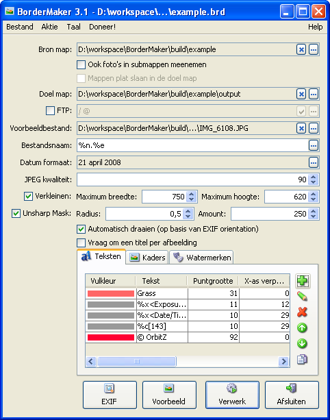 OrbitZ heeft een nieuwe versie van Bordermaker uitgebracht. Het programma is aangekomen bij versienummer 3.1, die vanaf deze pagina voor onder meer Linux, Windows en Mac OS X gedownload kan worden. Bordermaker is een handig programma voor de fotograaf waarmee kaders, teksten en watermerken in en om digitale foto's geplaatst kunnen worden. De software is geschreven in Java en kan daardoor op een groot aantal besturingssystemen gedraaid worden. Bordermaker 3.1 kent een klein aantal verbeteringen, waaronder het bewaren van de exif-informatie van foto's die verkleind zijn. Daarnaast is het programma getweakt waardoor het verkleinen van grote aantallen van foto's minder tijd in beslag neemt. Het volledige changelog ziet er als volgt uit: