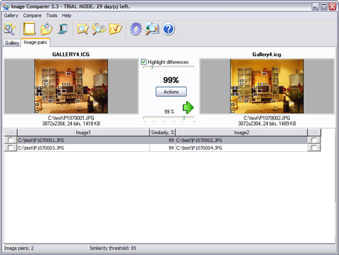 BolideSoft, bekend van de catalogusprogramma's All My Movies en All My Books, heeft versie 3.8 build 711 van Image Comparer uitgebracht. Zoals de naam al doet vermoeden, kan dit programma afbeeldingen vergelijken om bijvoorbeeld doublures op te sporen. Op zich niet bijzonder, maar dit programma vindt ook duplicaten die een andere grootte, resolutie of zelfs bestandsformaat hebben. Het geeft in procenten aan hoe groot de kans is dat een afbeelding gelijk is aan een andere. Image Comparer kan overweg met jpeg, j2k, bmp, gif, pcx, png, tiff, tga, ico en cur. Een Nederlandse handleiding is hier te vinden. Het changelog van deze release laat de volgende veranderingen zien: