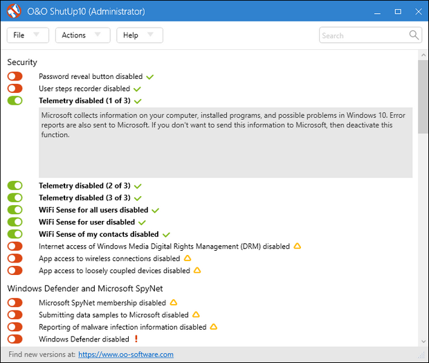 O&O Software, bekend van onder meer zijn defragmenteerprogramma, heeft een gratis tooltje beschikbaar gesteld waarmee veel van deze opties makkelijk aan- of uitgezet kunnen worden. Bovendien biedt het de optie om vooraf een systeemherstelpunt aan te maken. ShutUp10 is net geen 200kB groot en hoeft niet te worden geïnstalleerd om zijn werk te kunnen doen. In deze uitgave is ondersteuning toegevoegd voor de Fall Creators Update van Windows 10, maar sinds versie 1.4.1385 is er meer veranderd.