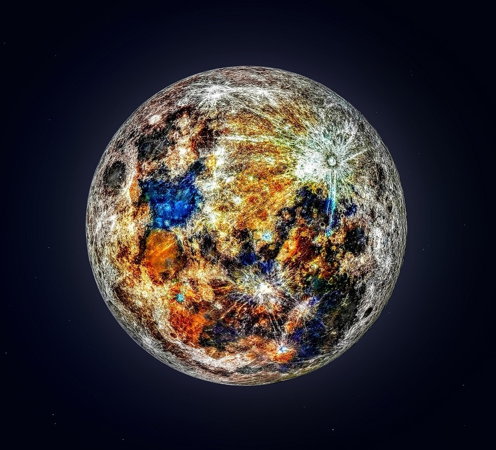 De astrofotografie-liefhebber Andrew McCarthy heeft een foto gepubliceerd van de maan met een bont kleurenpalet, in plaats van de witte, grijze en zwarte kleuren die we gewend zijn te zien. Om de kleuren tevoorschijn te toveren gebruikte hij 150.000 foto's.