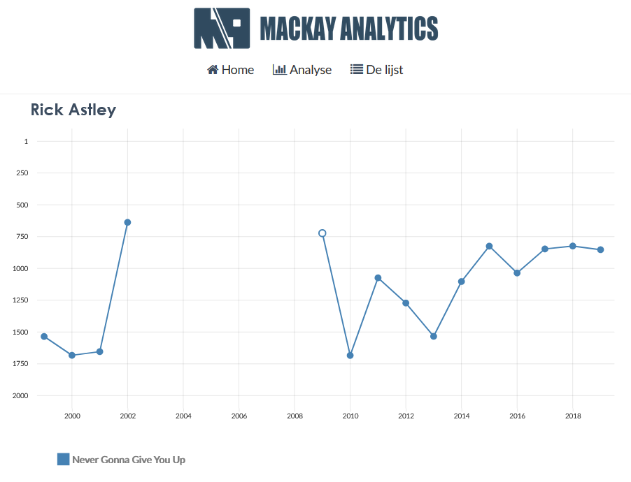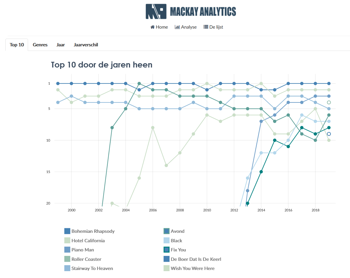 Interessant is ook om te zien welke nummers juist heel stabiel zijn. Bohemian Rhapsody van Queen is daar wellicht het ultieme voorbeeld van: het nummer staat altijd op nummer een, met uitzondering van de jaren 2005, 2010, 2014 en 2015, waarin het altijd op twee staat. The Eagles hadden met Hotel California op twee van die jaren de toppositie.