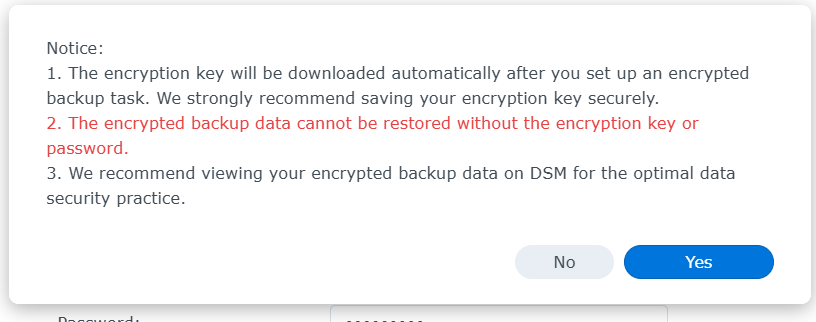 De Synology Back-up dmv Hyper backup, ja die is encrypted als jij dat wilt. ik doe dit dmv van 2 verschillende nextcloud servers die ergens in Europa staan middels Webdav. je maakt een wachtwoord aan bevestigd deze en er word automatisch een encryption key gedownloaded om in een later stadium de Back-up eventueel terug te kunnen zetten. werkt allemaal heel simpel.