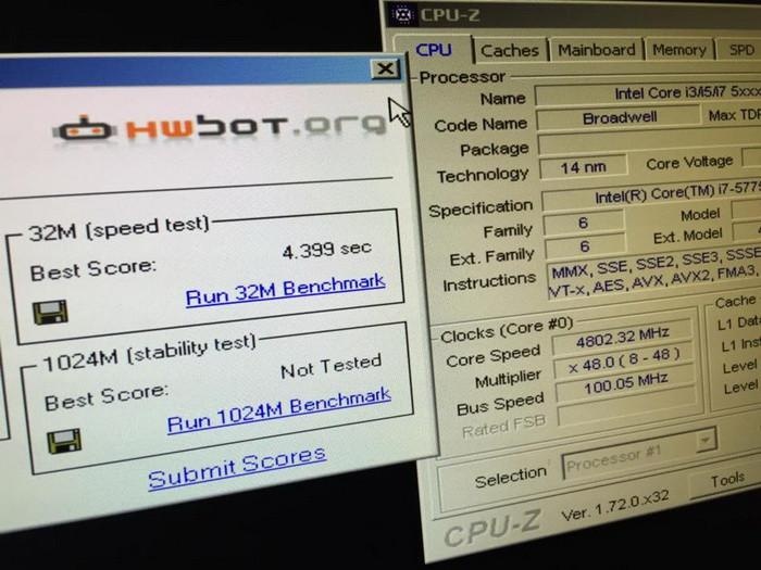 Op die snelheid draaide Windows 7 niet stabiel genoeg om een benchmark te draaien, maar de overklokker kon wel een CPU-Z-screenshot nemen. Op 4,8GHz kon 32M wPrime wel gedraaid worden; de processor zette een score van 4,3999 neer bij de benchmark.