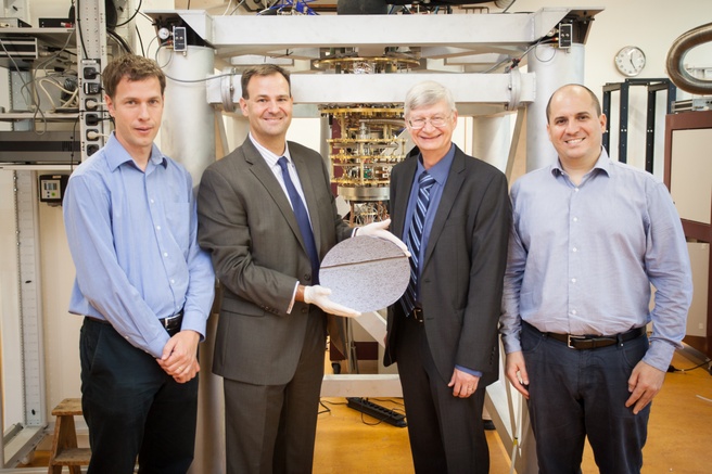 Van links naar rechts: Lieven Vandersypen (hoofdwetenschapper quantum computing TU Delft), Jim Clarke (Manager of Interconnect Research, Intel Components Research group), Mike Mayberry (Intel vice president en managing director van Intel Labs), Leo di Carlo (kwantumwetenschapper bij QuTech).