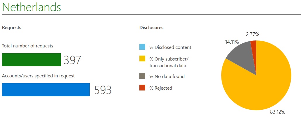 In de eerste helft van 2015 hebben Nederlandse autoriteiten 397 dataverzoeken ingediend bij Microsoft, die betrekking hebben op 593 accounts. Dat is meer dan in het voorgaande halfjaar. In België vroegen de autoriteiten juist minder vaak gebruikersdata op.