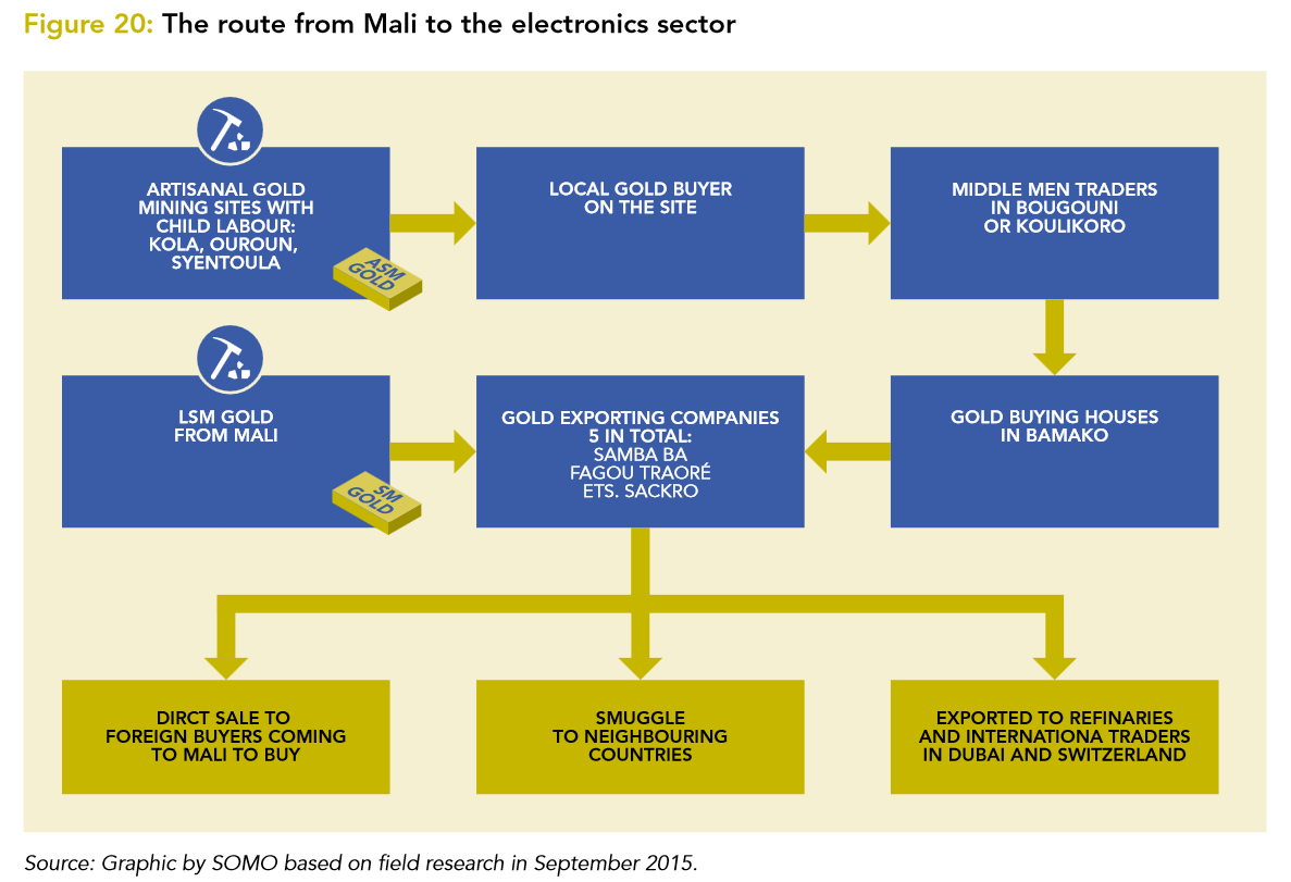 Volgens het onderzoek van onderzoeksbureau SOMO gebruikt de elektronicasector jaarlijks 279.000 kilo goud. Daarmee is het na de juwelenindustrie en de financiële sector de grootste afnemer van goud ter wereld. In de goudmijnbouw werken volgens het rapport meer dan een miljoen kinderen. In Burkina Faso is het percentage goudmijnwerkers dat uit kinderen bestaat 30 tot 50 procent. In Mali is dat 20 procent; het aantal kinderen in de goudmijnen is daar toegenomen van 20.000 in 2011 naar 200.000 in 2015, claimt SOMO.