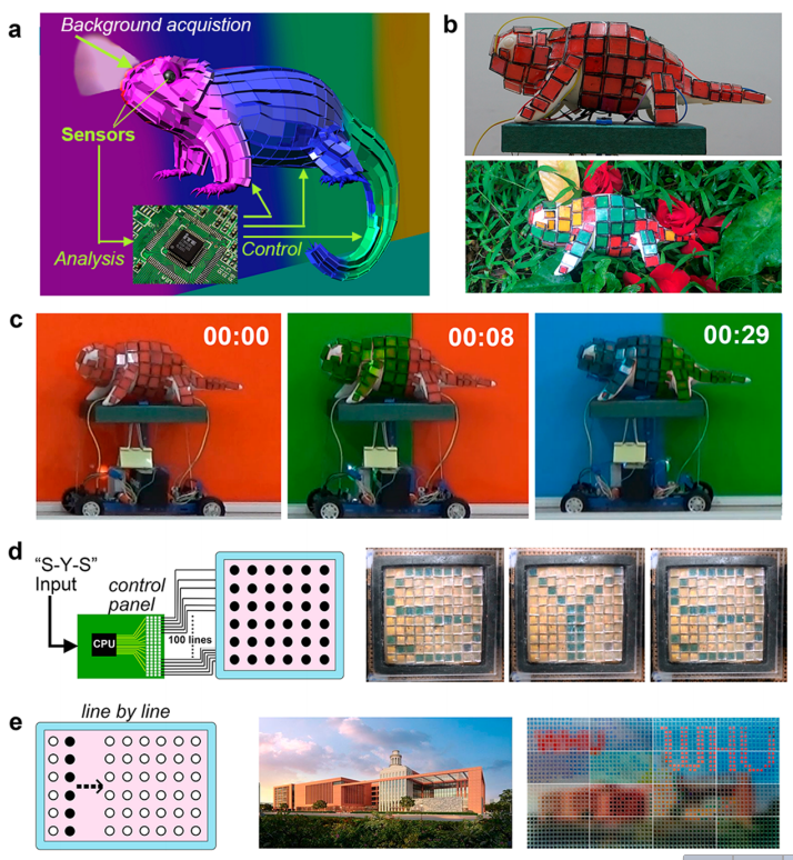 De robotkameleon is gemaakt met een 3d-printer, waarna de robot is bedekt met plasmonische schermen. Het doel van het onderzoek is het maken van een methode waarmee actieve camouflage zich snel kan aanpassen aan zijn achtergrond. Om dit doel te bereiken hebben de onderzoekers gekozen voor plasmonische modulatie. Plasmonische nanostructuren van metaal kunnen namelijk worden gebruikt om zowel optische reflectie als absorptie af te stemmen. Daardoor kunnen de displays van kleur veranderen als er gebruik wordt gemaakt van de interactie tussen elektrische velden en nanostructuren.