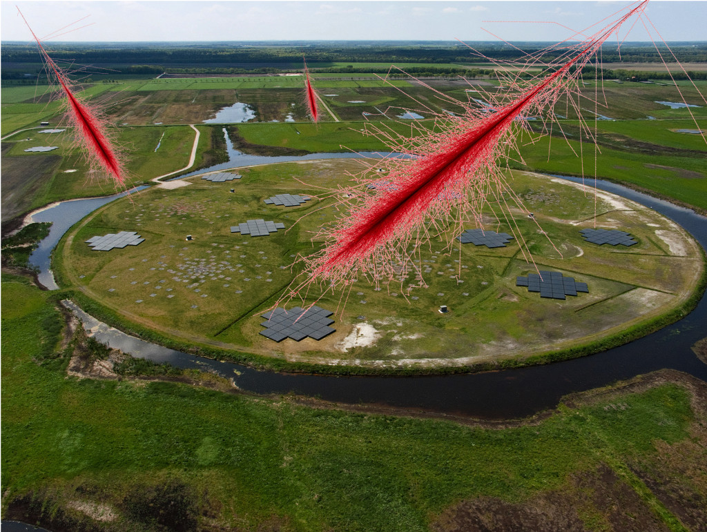 Radiosignalen die na een deeltjesdouche neerdalen op de Drentse Lofar-telescoop. Beeld: Heino Falcke, Radboud Universiteit