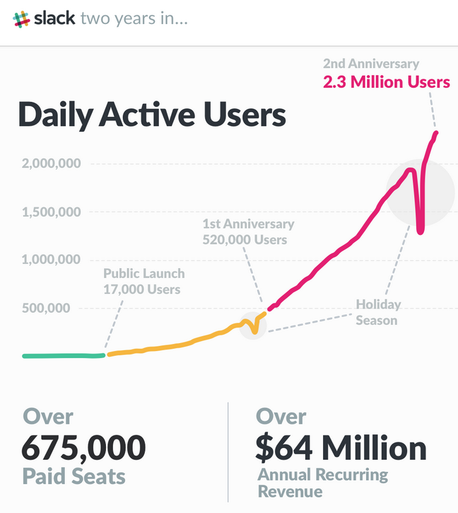 Naar eigen zeggen heeft Slack 2,3 miljoen dagelijks actieve gebruikers, waarvan er 670.000 betalen voor de dienst. Slack wordt veelal gebruikt in zakelijke omgevingen. Kleine teams kunnen gratis gebruikmaken van de dienst. Betaalde accounts bieden meer functionaliteit voor grotere groepen en kosten vanaf 6,67 dollar per maand per gebruiker. De dienst heeft een downloadwinkel voor apps, waarmee de functionaliteit kan worden uitgebreid. Inmiddels zijn er 280 apps beschikbaar.