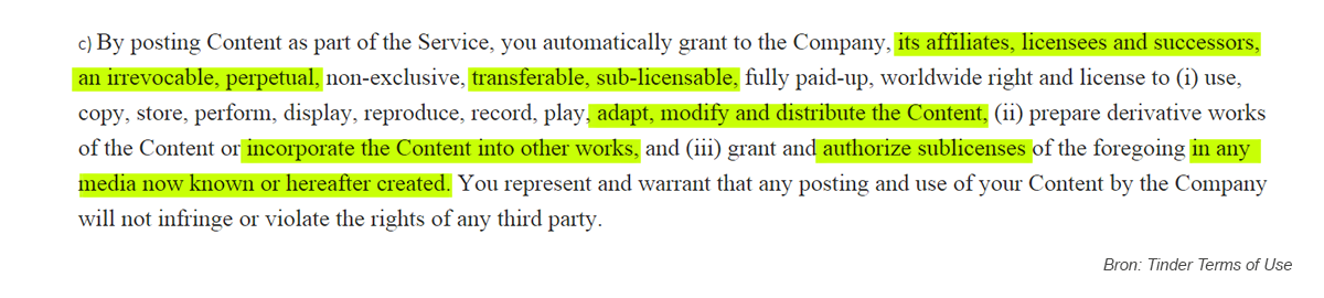 Het bedrijf stelt dat je een licentie geeft op het materiaal. Zowel nu als toekomstig.
