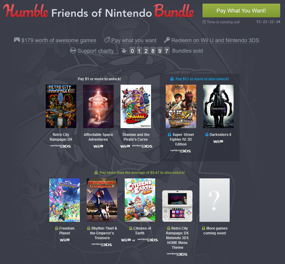 De Humble Friends of Nintendo Bundle volgt het bekende Humble-concept, waarbij een verzameling games kan worden aangeschaft voor een betaling vanaf 1 dollar. Door meer te betalen dan het gemiddelde, krijgen kopers meer games. Ook zijn er twee games die alleen verkregen kunnen worden door een bepaald bedrag te betalen. In het geval van de Nintendo-bundel gaat dat om Super Street Fighter IV: 3D Edition voor de Nintendo 3DS en Darksiders II voor de Wii U. Om deze games te krijgen moet minimaal 13 dollar betaald worden.