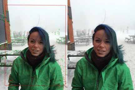 Links: origineel met virtuele camerapad en classificatie van de beweging: voorgrond rood, achtergrond groen. Rechts: het eindresultaat.