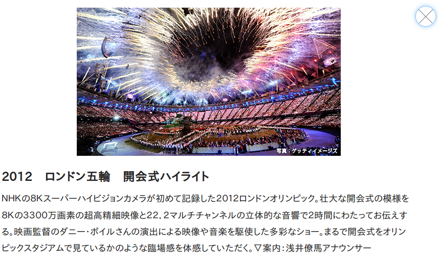 Op de dagen van de speciale uitzendingen kan dus gekeken worden naar een beperkt aantal sporten in speciale locaties die door NHK zijn opengesteld in de periode van 6 tot en met 22 augustus tussen 10 uur 's ochtends en 20 uur 's avonds. Ook zijn de openings- en afsluitingsceremonie in 8k live te bekijken. In totaal gaat het om 130 uur televisie.